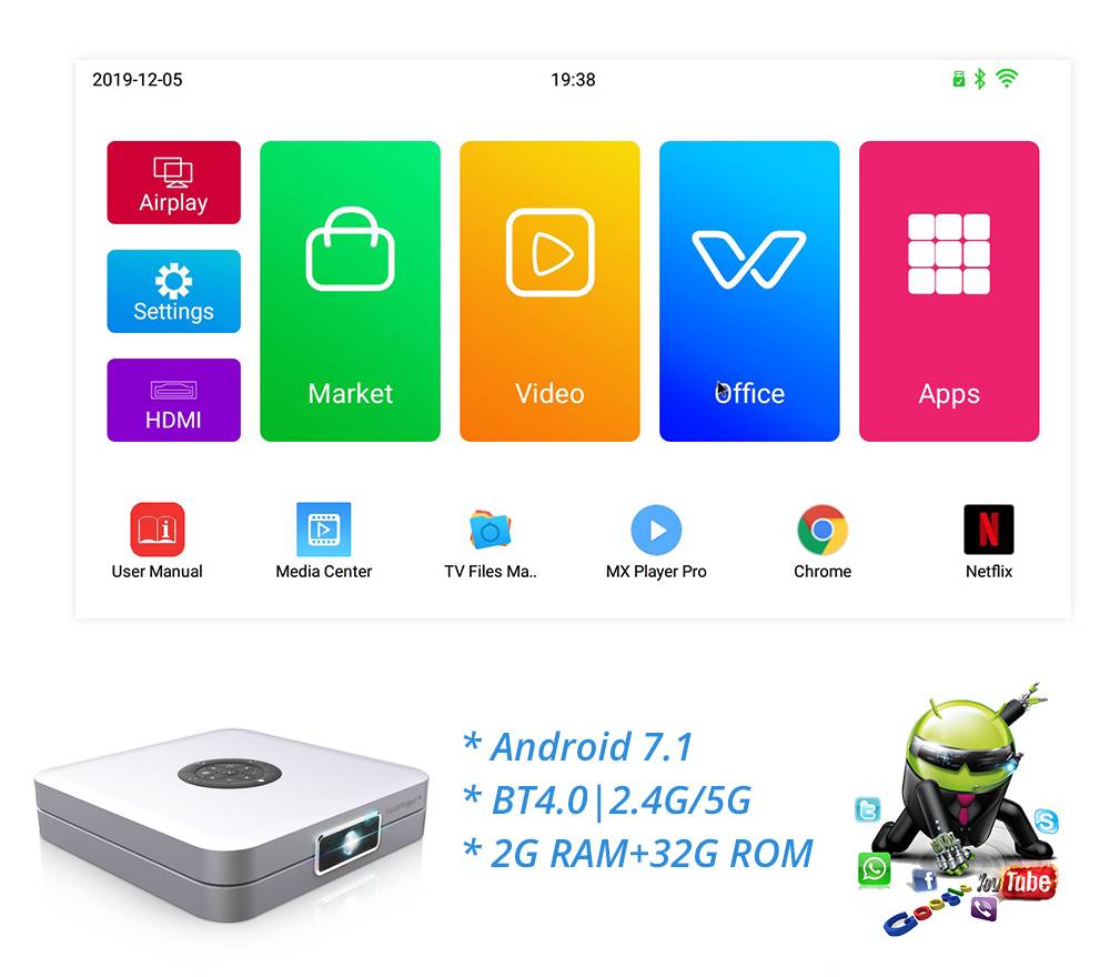 * Встроенный Android, вы можете установить несколько приложений по вашему желанию; * 2 Гб DDR3 ram + 32 ГБ rom; * Поддержка беспроводного/проводного зеркального отображения экрана; * Поддержка автоматической (только вертикальной) и ± 40 ° вертикальной и горизонтальной ручной коррекции трапецеидального камня; * Поддержка электронного масштабирования дисплея, легко регулируется размер экрана; * Поддержка электронного фокуса, более простая Настройка экрана; *Поддержка активного затвора 3D. (Только для 3D версии)