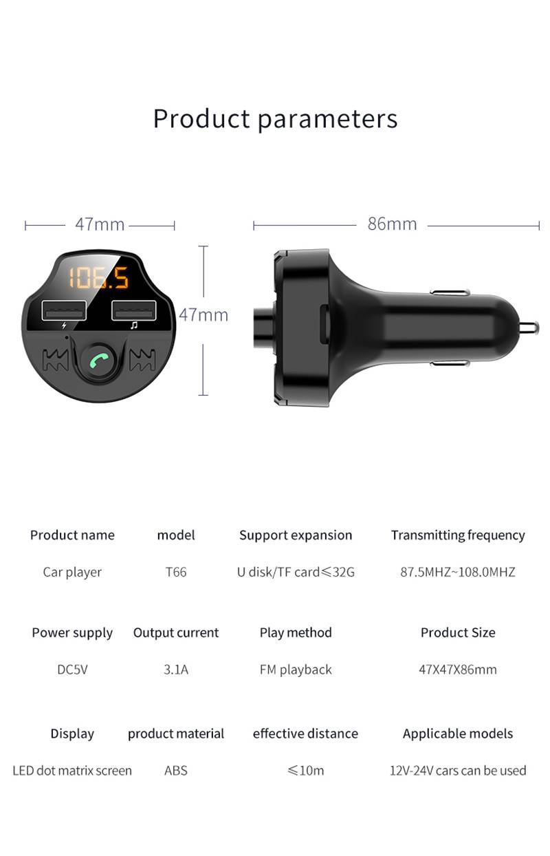Название: автомобильное зарядное устройство для телефона/Автомобильное зарядное устройство usb Подходящие модели телефона: Для всех брендов мобильный телефон/для всех моделей телефонов (для iPhone samsung xiaomi huawei htc LG Nokia Oneplus и так далее) Цвет: черный Протокол BT: A2DP, HFP,AVRCP Частотный диапазон: 87,5-108,0 МГц Вход: 12V-24V Карта Micro SD (максимальная емкость): 32 ГБ Usb-диск (максимальная емкость): 32 ГБ Поддержка: MP3/WMA/WAV и FLAV музыка Характеристики: по сравнению с традиционным автомобильным зарядным устройством всего от 0 до 25% за 40-60 минут, вы можете зарядить телефон, который поддерживает быстрое зарядное устройство 3,1 A от 0% до 80% примерно за 40-60 минут. Это быстрая зарядка Мощность: 30 Вт Посылка: 1 шт. автомобильное зарядное устройство