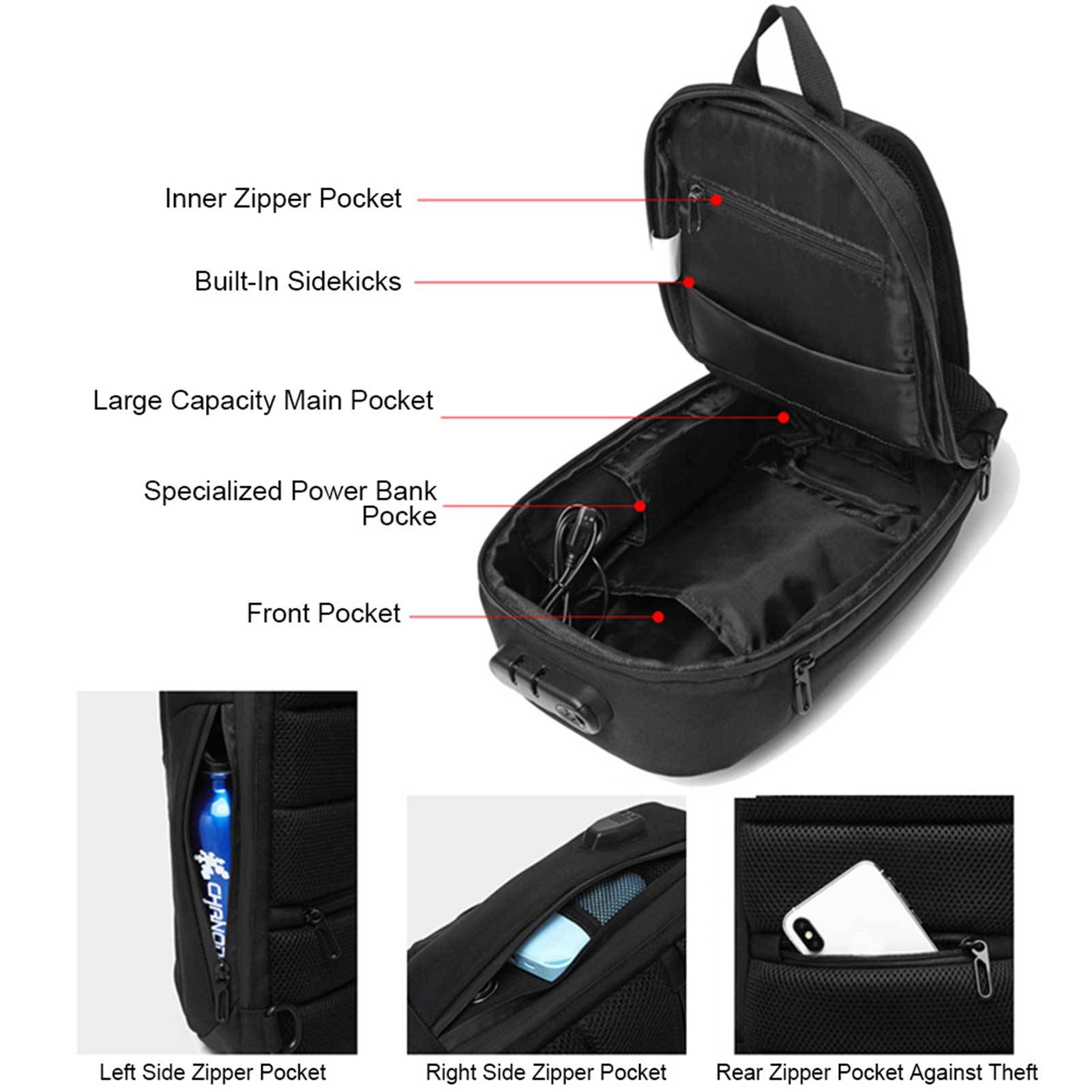 The chest bag is portable in size and weight, convenient to use. Super large inner capacity than normal bag. Extral USB charge port, free your hands. Upgrade safe level, anti-theft coded lock. Superior oxford fabric waterproof material.