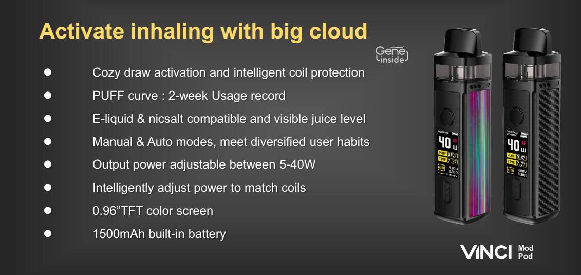 Описание: VINCI Mod Pod Kit от VOOPOO-это новый инновационный Ультрапортативный комплект модов pod, который сочетает в себе преимущества как устройств pod, так и коробочных модов. Работает от нового поколения чипа GENE.AI со встроенным аккумулятором 1500 мАч, он может поддерживать ручные и автоматические режимы для удовлетворения ваших различных потребностей в парении. Вы можете настроить выходную мощность от 5 Вт до 40 Вт с помощью кнопки вверх/вниз. Он оснащен инновационными режимами кривой буффа, которые могут записывать ваши двухнедельные привычки парить, чтобы принести Вам большое удобство. Он изготовлен из цинкового сплава, который украшен различными узорами панелей, чтобы дать вам различное чувство зрения. С цветным tft-экраном диагональю 0,96 дюйма, он может показать вам состояние аккумулятора, а также запись использования в течение 2 недель вашего устройства. Он поставляется с 5,5 мл вмещаемый объем жидкости для электронных сигарет, чтобы удовлетворяет ваши ежедневного использования. Он оснащен уникальной PnP-VM1 катушкой и совместим с электронной жидкостью и nic-salt vaping. Есть несколько способов защиты, чтобы обеспечить безопасность При парении. Доступно в 10 цветах: Углеволокно, опал, Космический серый, чернила, Аврора, алый, Ослепительный зеленый, павлин, холм желтый, нефрит зеленый. Параметры: Размер: 104,0x25,3x25,3 мм Аккумулятор: встроенный 1500 мАч Диапазон мощности: 5-40 Вт Диапазон сопротивления: 0,1-3.0ohm Выходное напряжение: 3,2-4,2 V Pod Ёмкость: 5,5 мл Катушка: PnP 0.3ohm, PnP 0.8ohm Материал: цинковый сплав + PCTG Цвет: Углеволокно, опал, Космический серый, чернила, Аврора, алый, Ослепительный зеленый, павлин, холм желтый, нефрит зеленый Детали: 1. Встроенный аккумулятор большой мощности 1500 мАч 2. 5,5 мл вмещаемый объем жидкости для электронных сигарет 3. Новое поколение GENE.AI chip 4. 0,96 "TFT цветной экран для отображения данных о парении 5. Кривая слойки будет записывать привычки парения в течение 2 недель 6. Совместим с E-liquid и nic-salt vaping 7. Регулируемая Выходная мощность: 5-40 Вт VINCI Mod Pod Kit посылка: Устройство VOOPOO Vinci-1 шт. 1 х VOOPOO Винчи Замена стручка (5,5 мл) 1 x Катушка VOOPOO PnP 0.3Ω 1 x Катушка VOOPOO PnP 0.8Ω Руководство пользователя (1 шт.) USB кабель (1 шт.); 1 x чип-карта GENE 1 х гарантийный талон