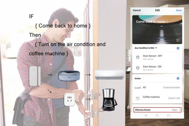 Мобильный телефон удаленно контролирует приборы. На улице или в компании, вы можете использовать приложение Tuya для удаленного управления бытовой техникой. Например, включите кондиционер по дороге домой и наслаждайтесь комфортной температурой дома.