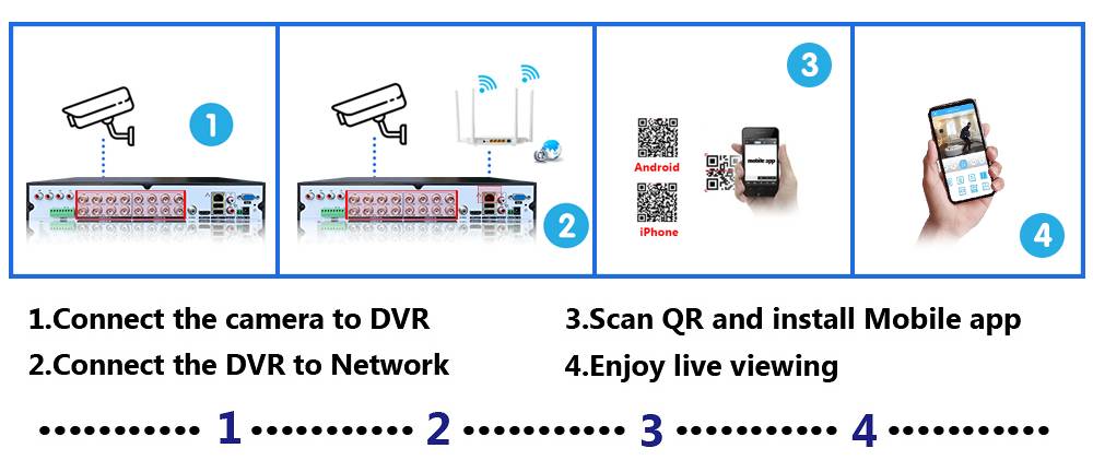 Простая настройка, всего 4 шага для просмотра мобильный телефон, просмотра видео в режиме реального времени из любого места и в любое время с помощью смартфона, стола или ПК с передовой технологией P2P, вы можете получить удаленный доступ к вашей системе за считанные минуты или меньше, нет необходимости в переадресации, удаленный доступ никогда не был таким простым!