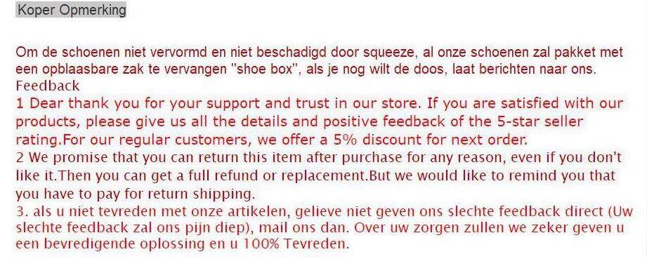Советы: (1) выбранный вами размер-это размер обуви, а не размер Великобритании. ------- (2) Если у вас полная и широкая стопа, пожалуйста, выберите больший размер. (3) китайские размеры обычно меньше европейских. ------- (4) Если вы не знаете, как выбрать, сообщите нам длину вашей стопы. ------- (5) обычно мы не отправляем обувную коробку, чтобы снизить ваши расходы и быстрее пройти таможню. Если вы хотите отправить товар в коробке, просто сообщите мне и оплатите еще 2 доллара США за каждую пару.