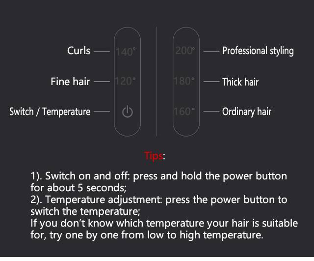 1). 100 ~ 130 °C подходит для поврежденных волос; 2) 140 ~ 160 °C подходит для мягких волос; 3). 170 ~ 190 °C подходит для нормальной доставки; 4). 200 ~ 230 °C подходит для грубых волос;