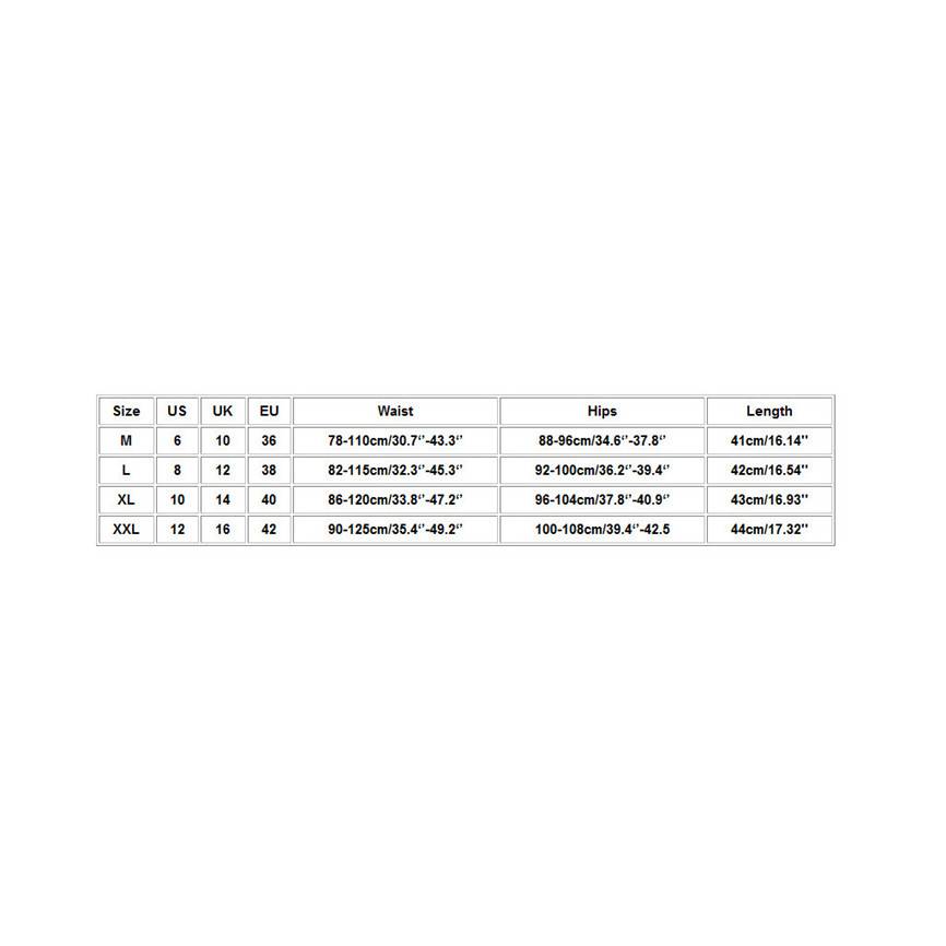 | Размер: XXL | США: 12 | Великобритания: 16 | ЕС: 42 | Талия: 90-125 см/35,4 ''-49,2'' | Бедра: 100-108 см/39,4 ''-42,5 | Длина: 44 см/17,32'' |