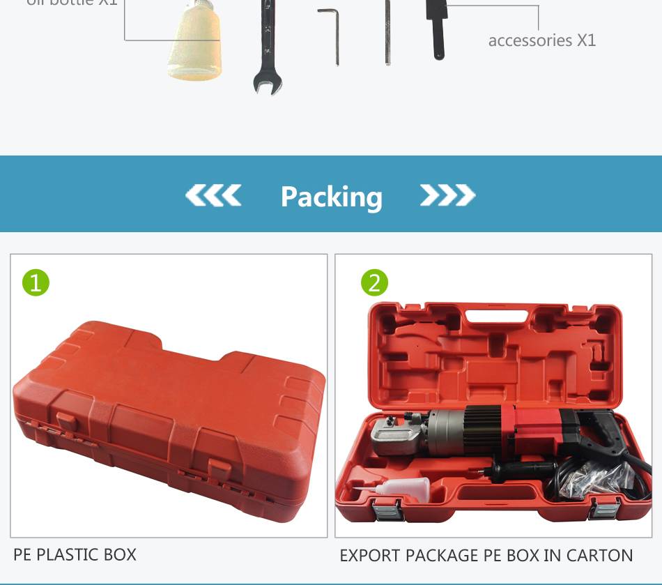 Размер (Д * Ш * В):44x11x22 Сертификация: CE ROHS KC Напряжение: 220 В/110 В, 220 В/110 В Мощность (кВт):850 Применимые отрасли: магазины строительных материалов, ремонтные магазины машин, розничная торговля, Домашнее использование, строительные работы Основные пункты продажи: энергосбережение Вес (кг):10 Название продукта: резец арматуры Функция: отрезать стальной стержень Скорость резки: 2-2.5s Диапазон резки: 4-16 мм Цвет: на заказ Мощность двигателя: 850 Вт/900 Вт Вес брутто: 12,5 Вес нетто: 10 Применение продукта Подходит для строительный арматурный профиль отрезан. Этот продукт-светильник небольшого размера, легко носить с собой. Нет искры и пыли Во время резки, безопасно и надежно. Модель SC-16B Напряжение 220v/110v Мощность 850 Вт/900 Вт Диапазон резки 4-16 мм Скорость резки 2-2.5s Вес нетто 10 кг Вес брутто 12,5 кг Размер формы 44х11х22см Размер упаковки 48х15х31 см