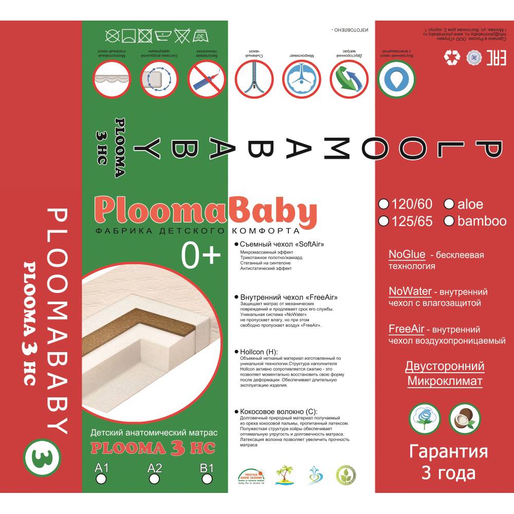 • Производство Россия. Торговая марка PLOOMABABY на рынке уже более 10 лет. И за это время зарекомендовала себя как качественный и надежный производитель матрасов Европейского качества. Продукция изготавливается на самом современном и высокотехнологичном оборудовании с соблюдением всех норм и соответствует стандартам ЕАС. Вся продукция имеет сертификацию и соответствует требованиям технического регламента Таможенного союза ТР ТС 025/2012 «О безопасности мебельной продукции».