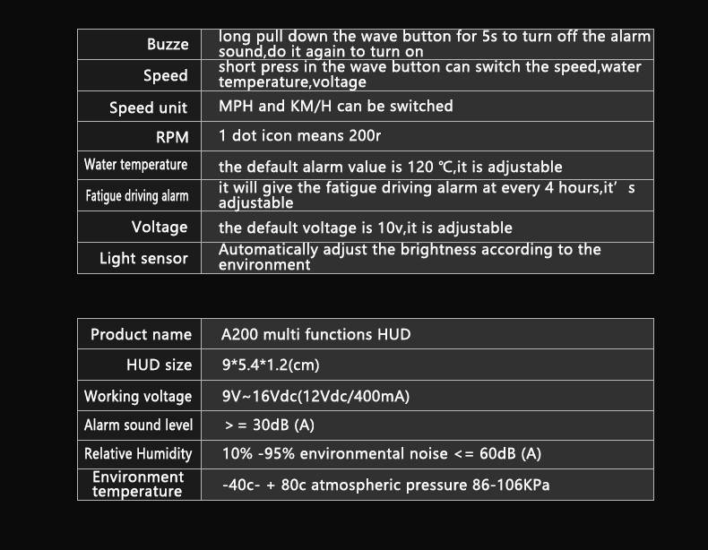 6. Автоматическое включение/выключение: HUD старт и выключен с автозапуском и выключением, эффективная защита автомобиля от аккумулятора; При этом сохраняется режим ручного переключения, и более легко контролировать HUD.