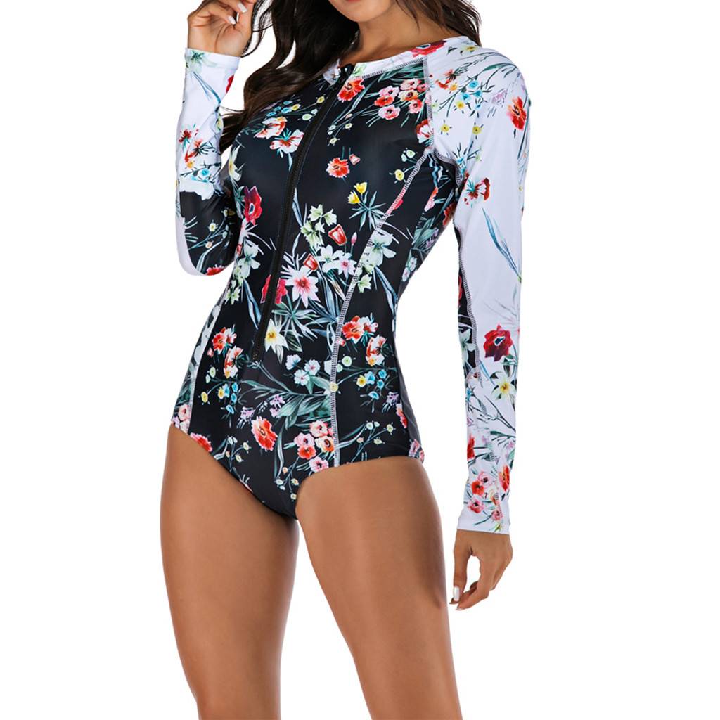 Women Fashion Zipper Tropical Plants Print Diving Surfing Conjoined Suit Set