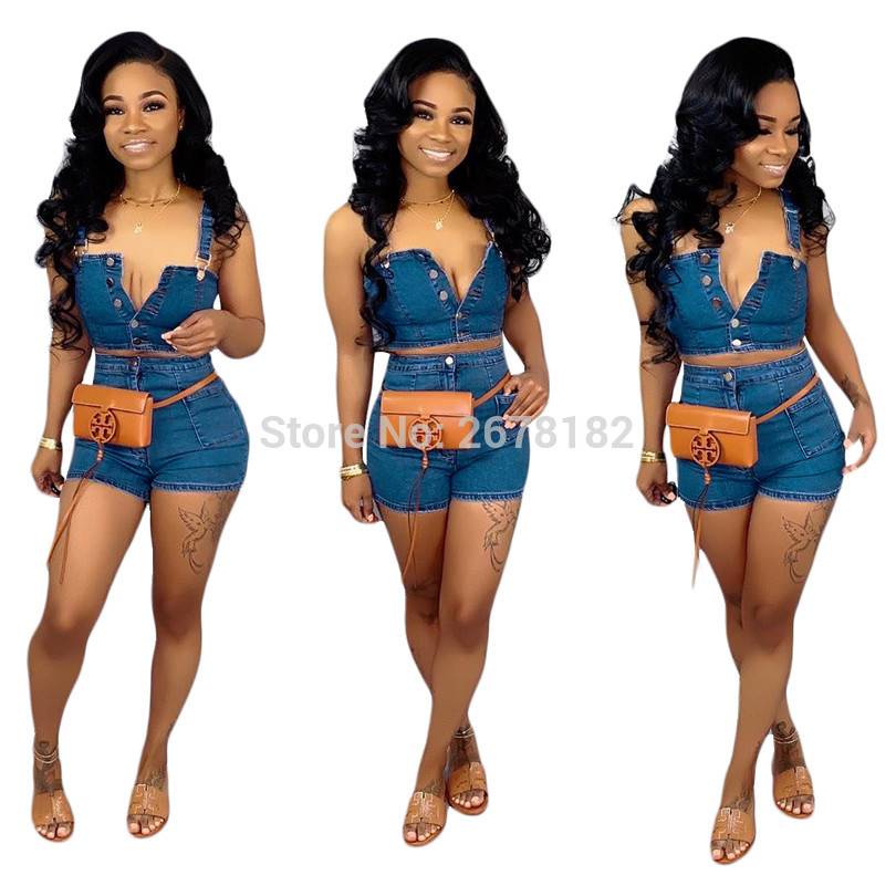 Женский Повседневный Летний джинсовый комплект из двух предметов, укороченный топ на бретельках с пуговицами + шорты, вечерние комплекты для ночного клуба, уличная одеждаUS $23,58