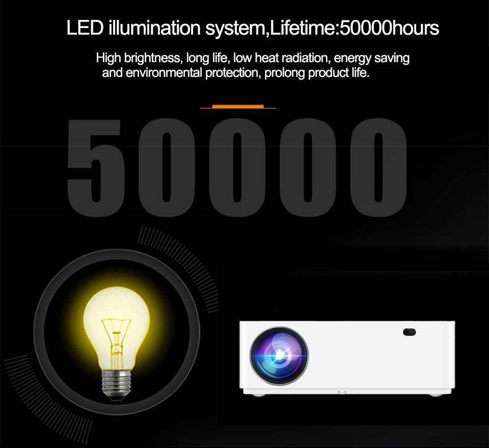 Домашний проектор M20 оснащен светодиодный лампой.Срок службы лампы до 50000 часов.Это означает, что вы можете использовать более 10 лет.