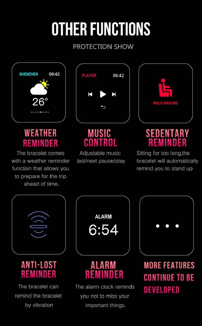 Напоминание о малоподвижности, поиск браслета, камера дистанционного управления.