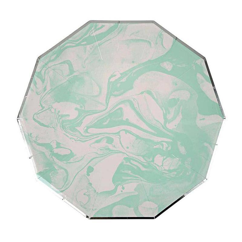 С дизайном зеленого мрамора, этот набор посуды шикарный и модный. Этот продукт обеспечивает основные вечерние товары, которые вам нужны, поможет вам провести полные и роскошные вечерние мероприятия. Подходит для различных партий, как, например, на день рождения, Детские вечерние, Гавайи, вечерние вечеринки будущей матери, и т. д.8 круглых больших тарелок