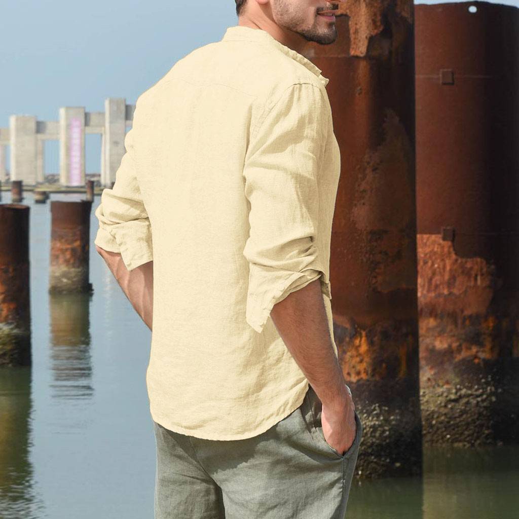 Мужская мешковатая хлопковая льняная Однотонная рубашка с длинными рукавами и карманами на пуговицах и воротником-стойкой