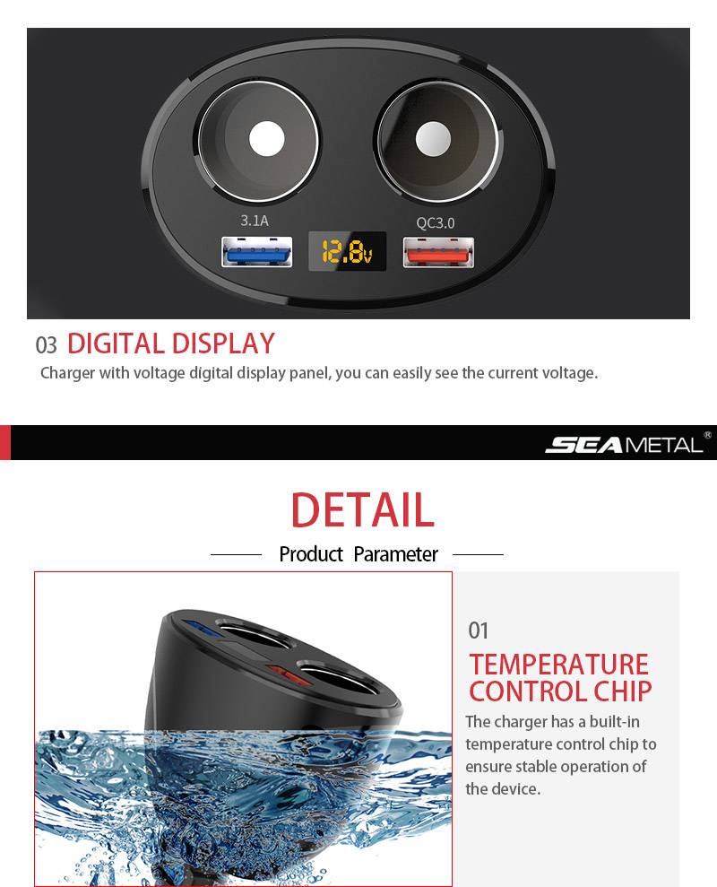 1. Два отверстия для прикуривателя; Два usb-порта, один 3,1 А, один QC зарядка;