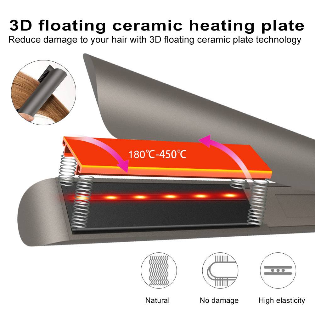 1. Прямой рулон Два в одном зажим для платы 2. Нагревание до 450 ℃ занимает всего 45 секунд. Автоматическое выключение 3,60 минут 4. Регулируемая температура (180 ℃-450 ℃) 180 ℃-225 ℃ поврежденные волосы 255 ℃-340 ℃ средние волосы 340 ℃-375 ℃ густые волосы 375 ℃-450 ℃ жесткие волосы 5. Использование керамических отрицательных Лун и инфракрасной технологии, может ухаживать за волосами, держать волосы влажными и блестящими. 6. Светодиодный дисплей, кнопка регулировки температуры, кнопка блокировки безопасности, шнур с поворотом на 360 °. 7.3D плавающая керамическая нагревательная пластина.