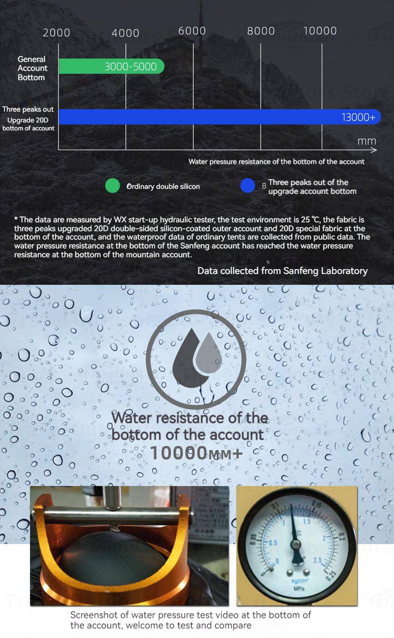 Дно тента: 20D светильник Силиконовый водонепроницаемый нейлон (водонепроницаемый индекс 5000 мм)