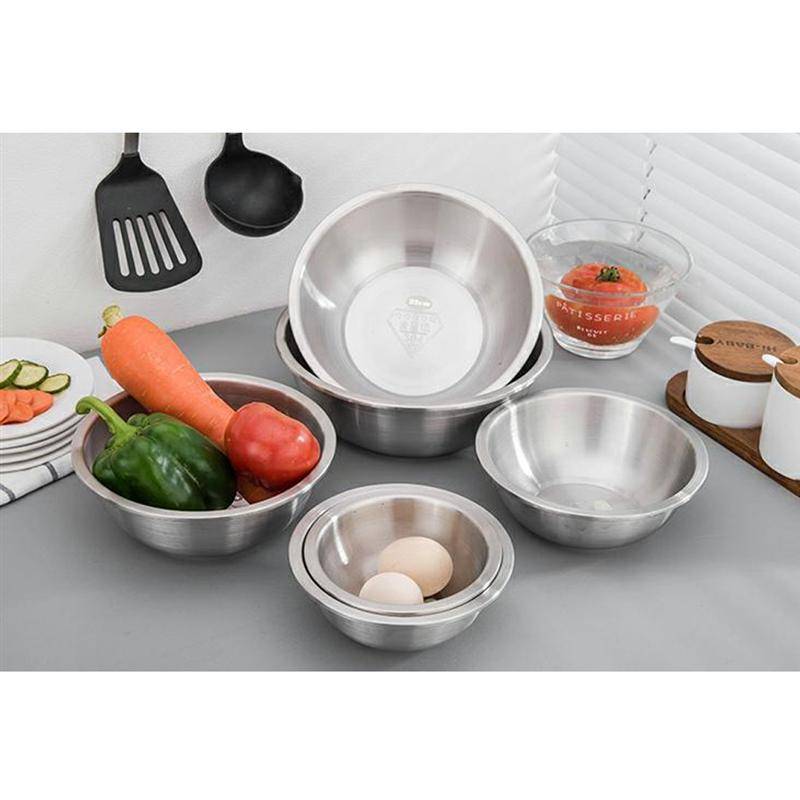 Миски из нержавеющей стали с коммерческим металлом, который может использоваться как миски для выпечки, так и сервировочные миски. Эти металлические миски не испачкают и не впитывают запахи и не ржавеют в течение многих лет долговечности. Хорошо оборудован для подачи фруктовых салатов, маринования для гриля и добавления последних ингредиентов на десерт.