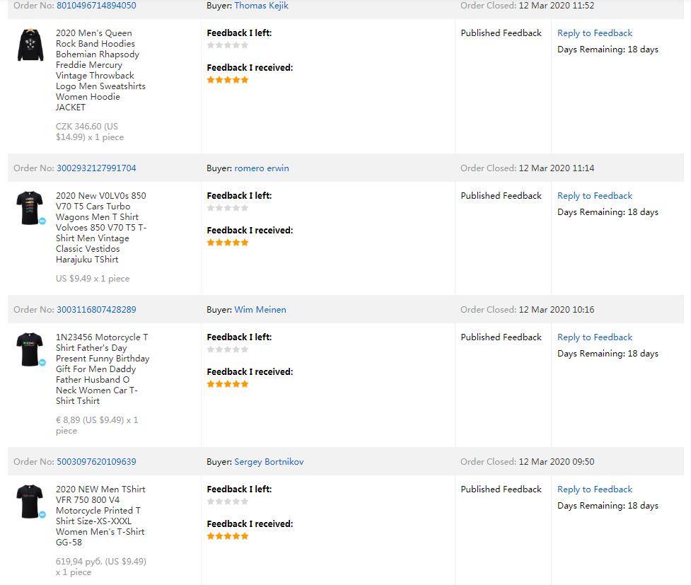 [2019-12-13 12:34:42]Елена: Заказываю всегда помногу товаров на aliexpress. К счастью магазин еще н разу не разочаровал меня качеством товаров. Заказала эту футболку размера S. Через три недели получила заказанную вещь, в хорошей упаковке без повреждения. Полученная футболка оказалась именно такой, как я хотела, ...Читать полностью...