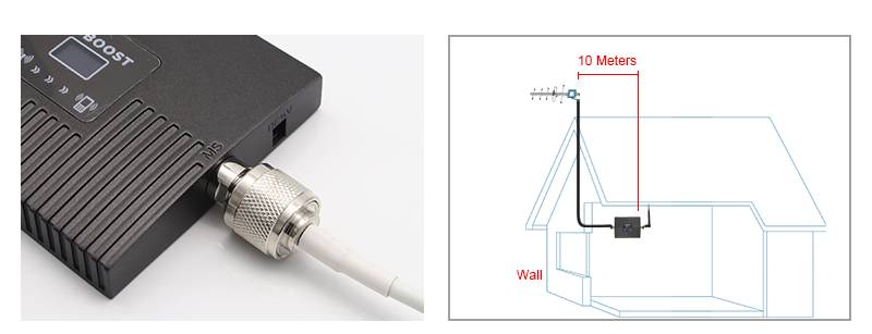 Шаг 2:Используйте кабель 10 м для подключения наружной антенны и бустера. Убедитесь, что они были затянуты, соединены хорошо.