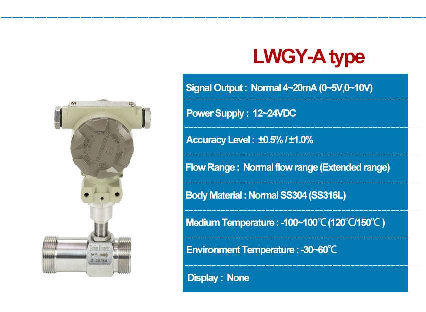 Тип LWGY-M0/M4 (Flange1,Clamp1,Thread1) Дисплей: цифровой ЖК-дисплей Источника питания: 12 ~ 24 В постоянного тока источника питания/3,6 v литиевая батарея источника питания Выход сигнала: Импульсный/4-20мА/RS485/нет, другие сигналы, такие как 0 ~ 5 В, 0 ~ 10 в, HART и т. д., должны быть уведомлены перед заказом. Тип LWGY-A (Flange2,Clamp2,Thread2) Дисплей: нет Источник питания: 12 ~ 24 В постоянного тока Выход сигнала: 4-20 мА, другие сигналы, такие как 0-5 В, 0-10 В и т. д., должны быть уведомлены перед заказом. Тип LWGY-N (Flange3,Clamp3,Thread3) Дисплей: нет Источник питания: 12 ~ 24 В постоянного тока Выход сигнала: импульсный