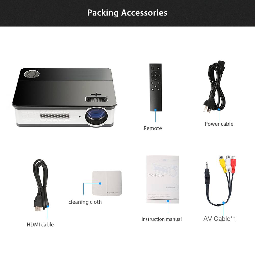 1x светодиодный проектор 1X Руководство пользователя 1x пульт дистанционного управления 1X Ткань для очистки 1X Кабель питания 1x av-кабель