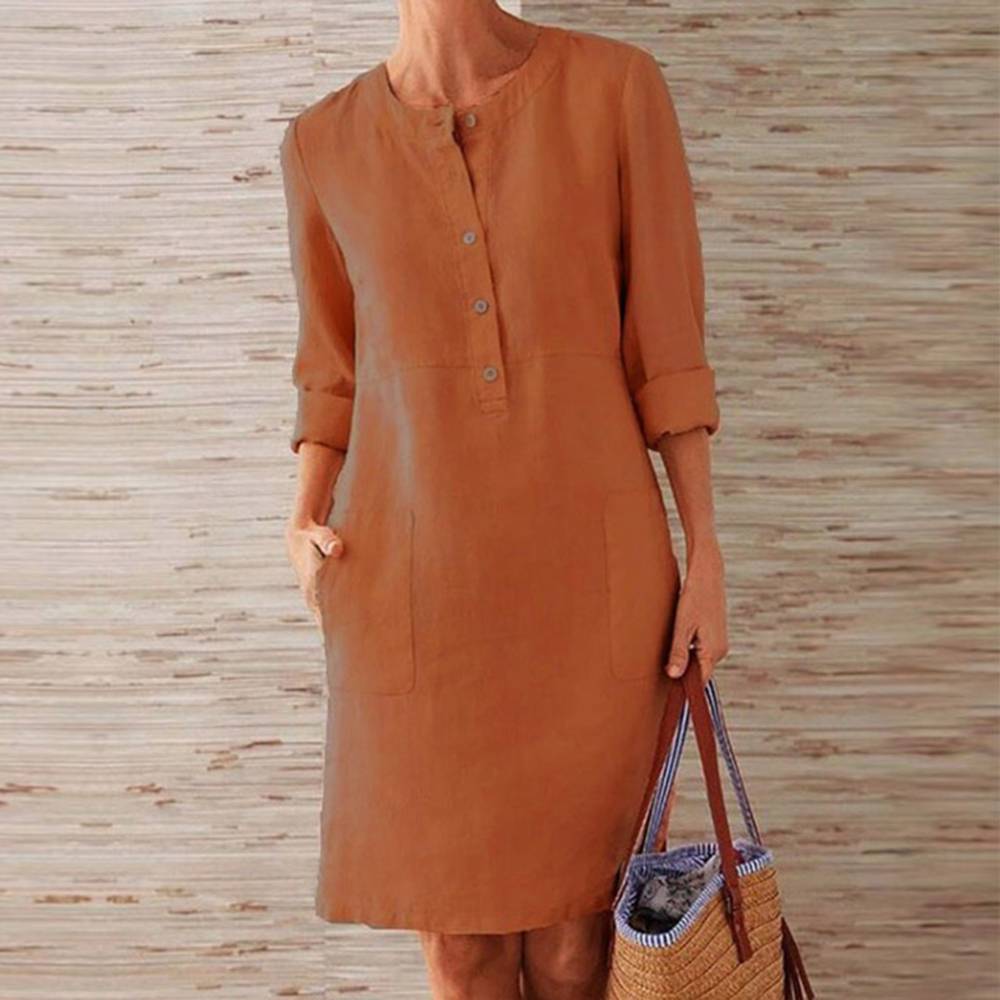 Spring Autumn Cotton Linen Dress 2020 Fashion Button O-Neck Knee Party Dress Women Long Sleeve Pocket Solid Dresses Plus Size