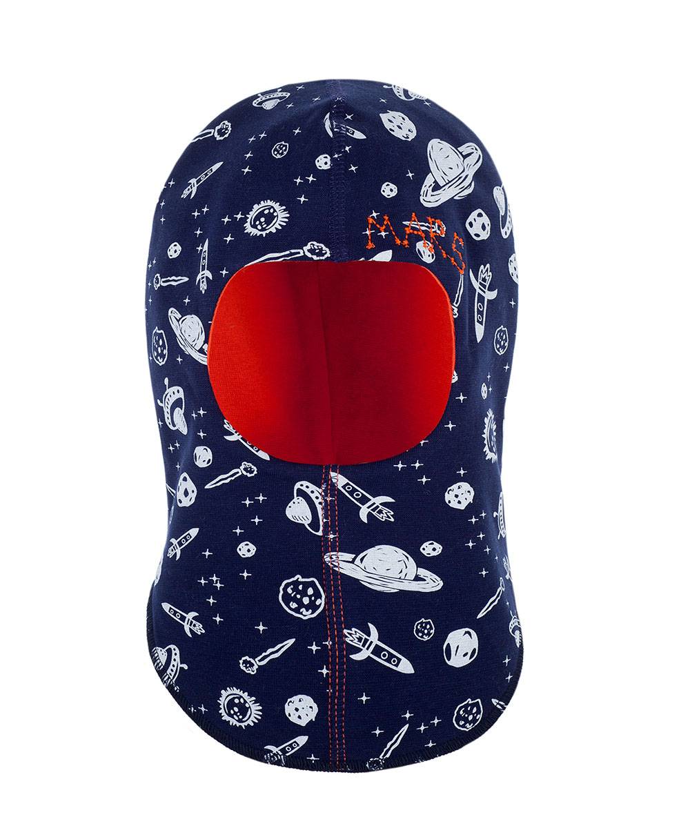 Двухслойный шлем для мальчика, изготовлен из рибаны. Декорирован вышивкой и принтом.