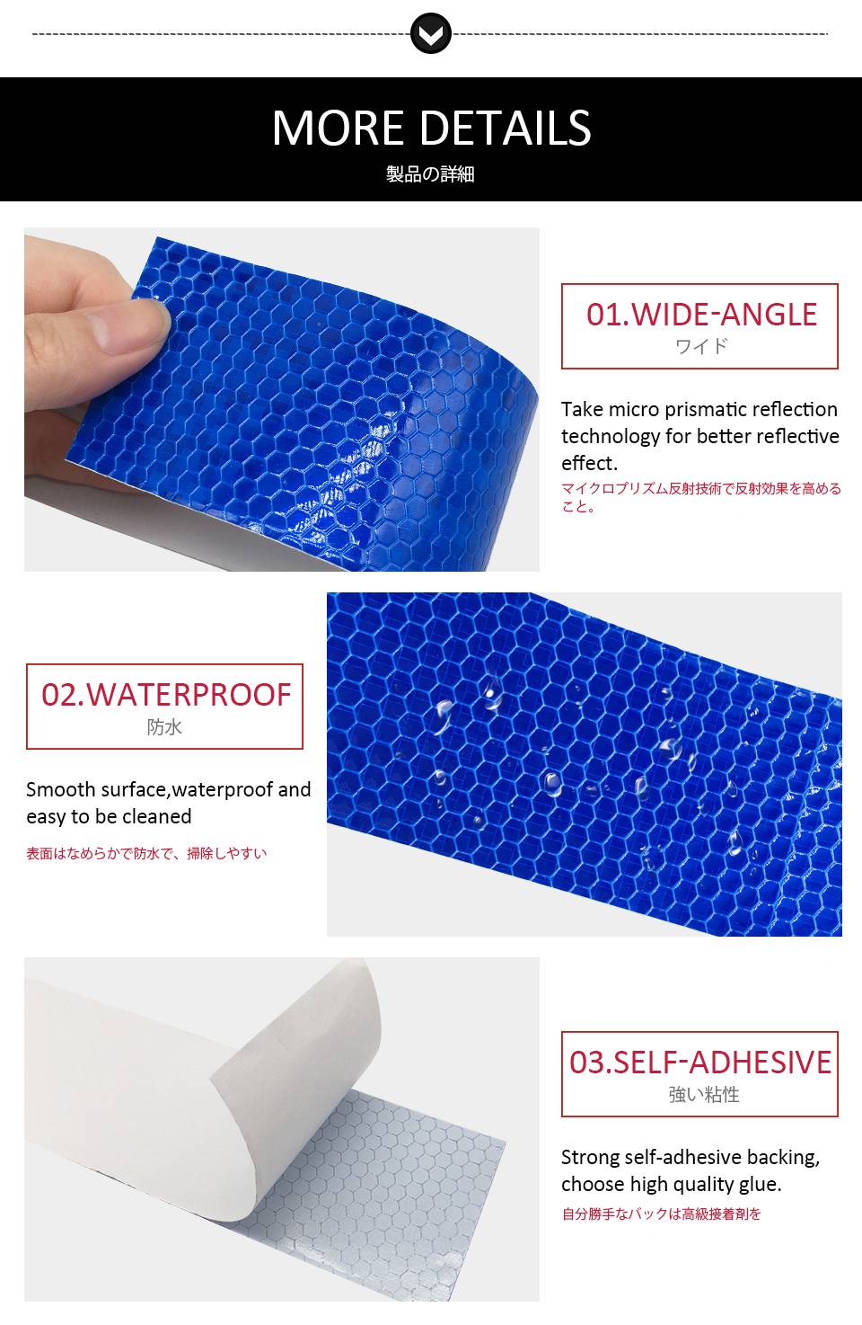 1. Высокая Светоотражающая и широкоугольная технология микропризматического отражения для лучшего отражающего эффекта.