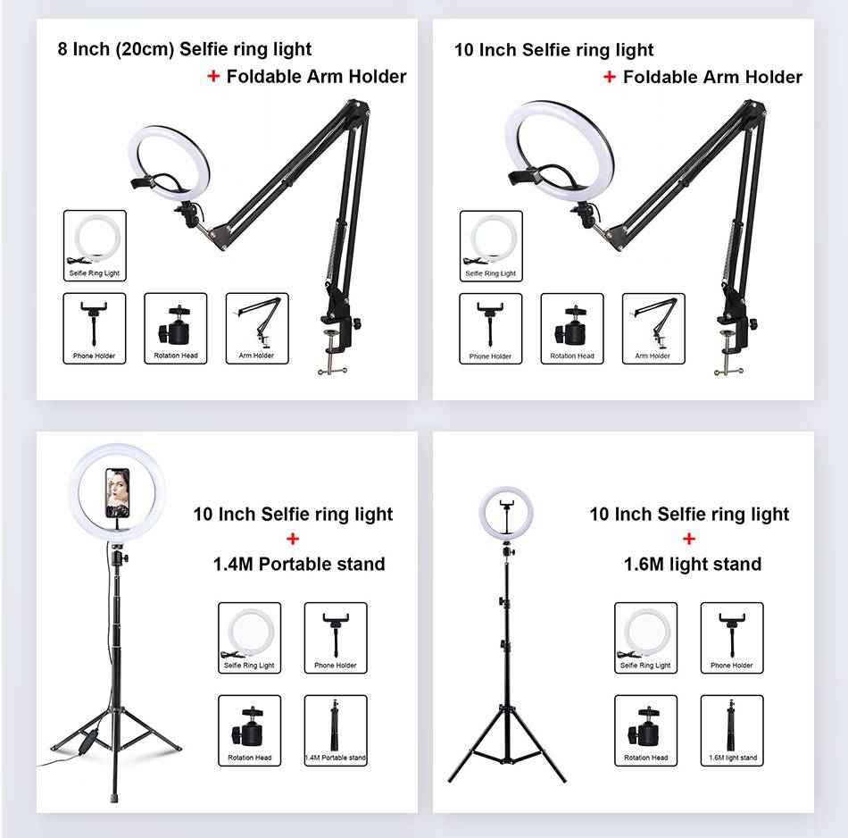 Опция «20 см светильник» и опция «26 см светильник»-это только кольцевые светильник без штатива или подставки. Если у вас нет собственного штатива, пожалуйста, убедитесь, что вы выбрали вариант с штативом или подставкой.