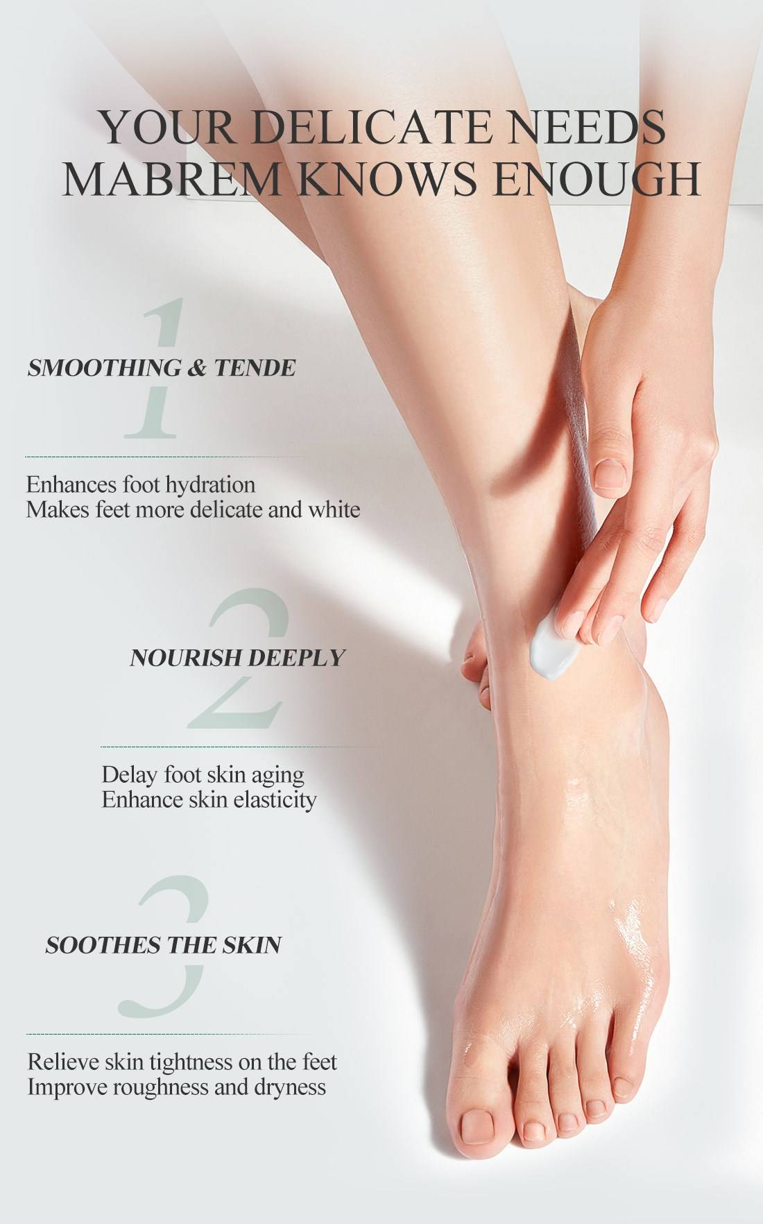 Текстура увлажняет и легко распределяется по стопе. Просто нанесите немного, он может впитаться кожей, чтобы сохранить увлажнение слой за слоем. Он содержит эссенцию календулы, которая пополняет питание и влагу, делает его увлажняющим и нежным. Между тем, он может помочь разгладить огрубевшую кожу, чтобы увеличить нежность кожи, что позволяет легко показать ваши нежные и влажные красивые ноги.