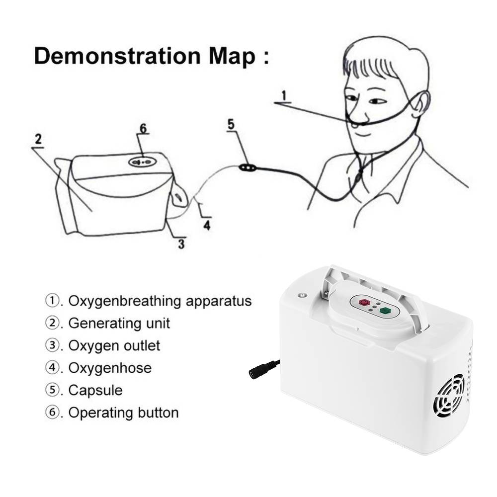Инструкции по аксессуарам: машина оснащена ручкой для удобной переноски; Цель зеленого мешка для хранения в носовой кислородной трубке заключается в сборе водяного пара, а не в добавлении воды, И целью конструкции является сохранение без накопившегося водяного пара внутри стенки трубы, Делает кислород более чистым и безопасным для прохода, когда в середине мешка находится водяной пар, его можно отвинтить, очистить внутреннюю часть мешка.