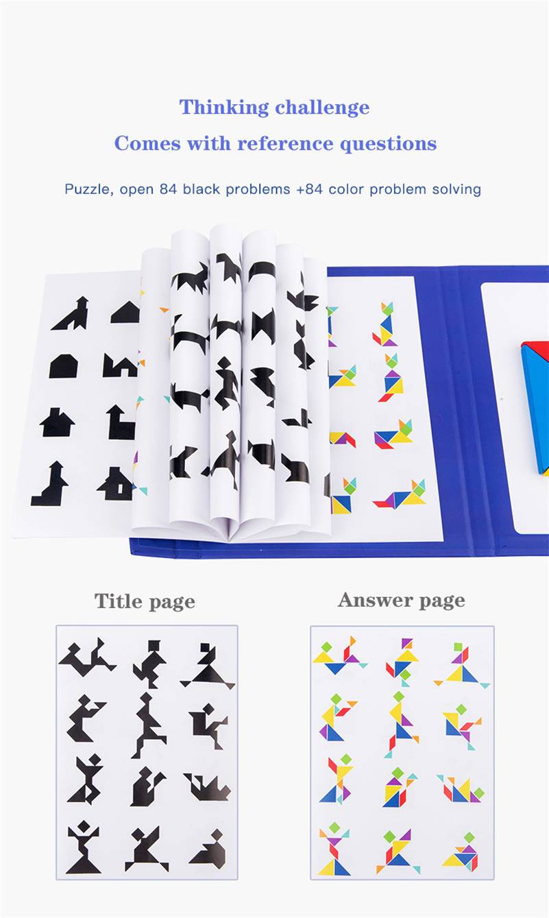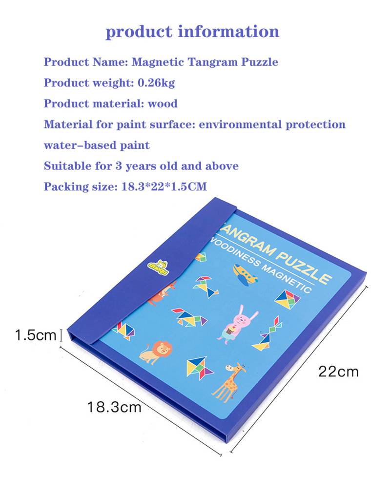 1. Логика мышление Научитесь распознавать геометрические фигуры Улучшить визуальное пространство ребенка поиск интеллекта от мелкого до глубокого 2. Пространство и графика Математические мышление прозрения Концепция пространства является основой для решения геометрических проблем. Создание графики улучшает гибкость мышления 3. Развивать мозг Упражнения логическое мышление способность Мышление вызов Поставляется со ссылкой на вопросы Название продукта: магнитный Танграм-пазл Вес изделия: 0,26 кг Материал товара: дерево Материал для поверхности краски: Экологически чистая краска на водной основе Подходит для детей в возрасте 3 лет и старше Размер упаковки: 18,3*22*1,5 см