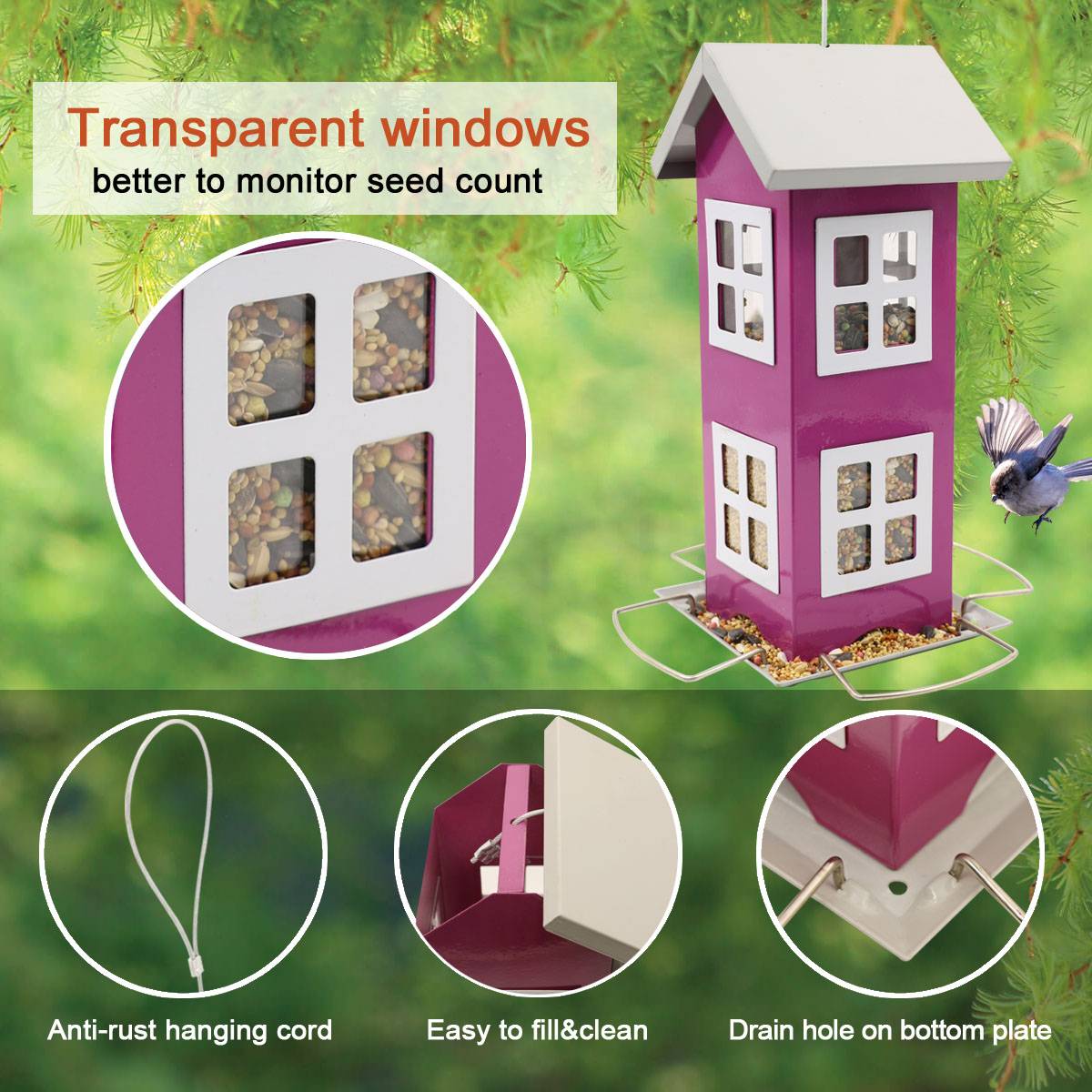 Дикие птицы любят его:Мы заботимся о диких птицах. Это помогает им легче находить еду в зимнее время. Идеально подходит для goldfinch, robin, chickadee, blue-bird, songbird, passerine, wren, sparrow, фиолетового finch и многого другого. С отверстиями для слива дождевой воды, питательной платформой и отсеками для птиц, это лучший питатель для диких птиц среди всех кормушек для птиц.