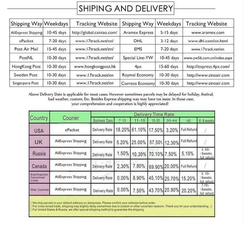 Способ оплаты 1. Существует множество способов оплаты на Aliexpress, таких как Alipay, кредитные карты, банковские переводы в реальном времени, офлайн-платежи (банковские переводы и Western Union). Вы можете выбрать наиболее удобный для Вас способ. Для защиты ваших интересов оплата будет временно задержана компанией Alibaba и не будет передана нам, пока вы не получите заказ и не подтвердите, что остались им довольны. Доставка 1. Когда мы получили информацию о вашем заказе и оплате, мы обычно 2-5 дней для завершения доставки, мы предоставляем информацию для отслеживания логистики. Однако из-за определенных факторов и региональных проблем, которые могут привести к задержке доставки, надеемся на понимание, время доставки обычно составляет 15-40 дней, пожалуйста, будьте терпеливы. 2. Если вам нужен более быстрый способ доставки, вы можете выбрать другие способы, пожалуйста, свяжитесь с нами. 3. Мы не несем ответственности за любые таможенные пошлины или налог на импорт. 4. Заказ будет отправлен в вашу руку транспортной компанией в течение срока доставки, соответствующего списку услуг доставки ниже. Если вы не получили посылка в течение срока доставки, пожалуйста, свяжитесь с нами, и мы ответим Вам в течение 24 часов. Политика Возврата 1. Мы полностью гарантируем наши товары. Все товары находятся в совершенно новом состоянии, если не указано иное в другом месте в описании. 2. Все возвраты-Бракованные или иные-должны быть предварительно разрешены. Пожалуйста, свяжитесь с нами, чтобы получить разрешение и обратный адрес, прежде чем отправить товар обратно. 3. Во всех случаях покупатели оплачивают стоимость доставки за свой счет, чтобы вернуть товары для обмена или возврата денег. Мы будем нести ответственность за почтовые расходы по замене. Свяжитесь с нами 1. Если у вас есть какие-либо вопросы, пожалуйста, свяжитесь с нами, мы ответим на ваши вопросы как можно скорее 2. Мы ответим на ваш вопрос по электронной почте, пожалуйста, проверьте ваш адрес электронной почты для получения ответов. Отзывы 1. Пожалуйста, напишите мне, прежде чем оставлять отзывы, Если вы недовольны своим товаром, чтобы мы могли разобраться. 2. Международные покупатели, пожалуйста, обратите внимание: импортные пошлины, налоги и сборы не включены в цену товара или стоимость доставки.