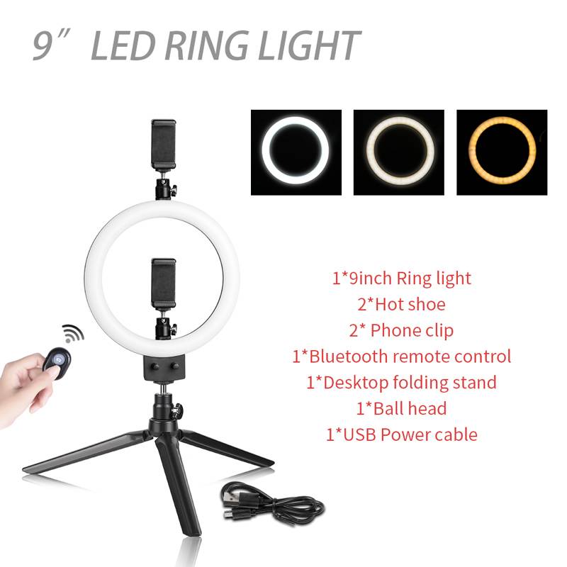 1 * Настольная Складная подставка 1*9 дюймов кольцевой светильник 1 * зажим для телефона 1 * USB кабель питания 1 * горячий башмак 1 * зажим для телефона