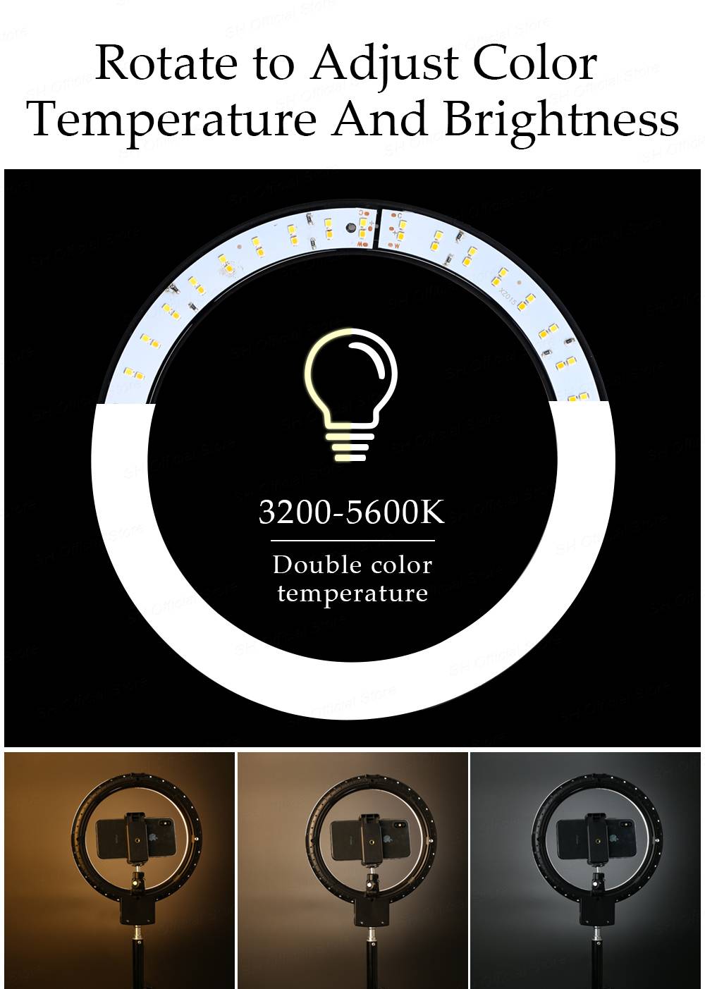 Светильник источник света: светодиодный SMD Светодиодный светильник: 80 шт. Форма: Кольцо Внешний диаметр: 23 см/9'' Внутренний диаметр: 18 см/7'' Мощность: 10 Вт Напряжение: 5 В Цветовая температура: 3200-5600K (бесступенчатая цветовая температура) Регулировка яркости: Да Диапазон затемнения: 1%-100% (плавное Затемнение) общая освещенность: 600 лм CRI (индекс цветопередачи): >83 Адаптер: универсальный штекер Тип: USB разъем Входное напряжение: широкий Напряжение (110-260 В) Кольцевой светильник Диаметр: 9 ''/23 см Pecifications: 3 цвета регулируемые (плавное Затемнение) Интерфейс: 1/4 универсальное винтовое отверстие