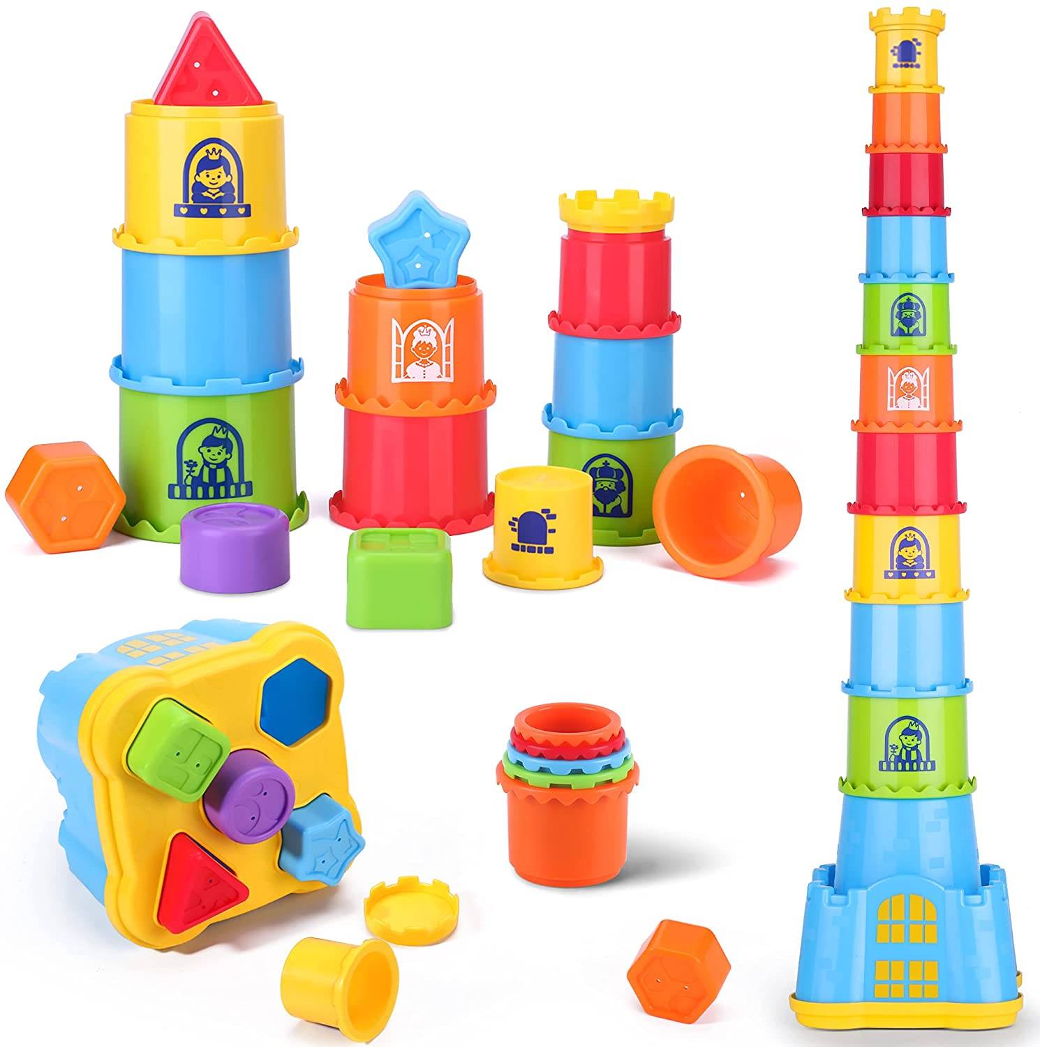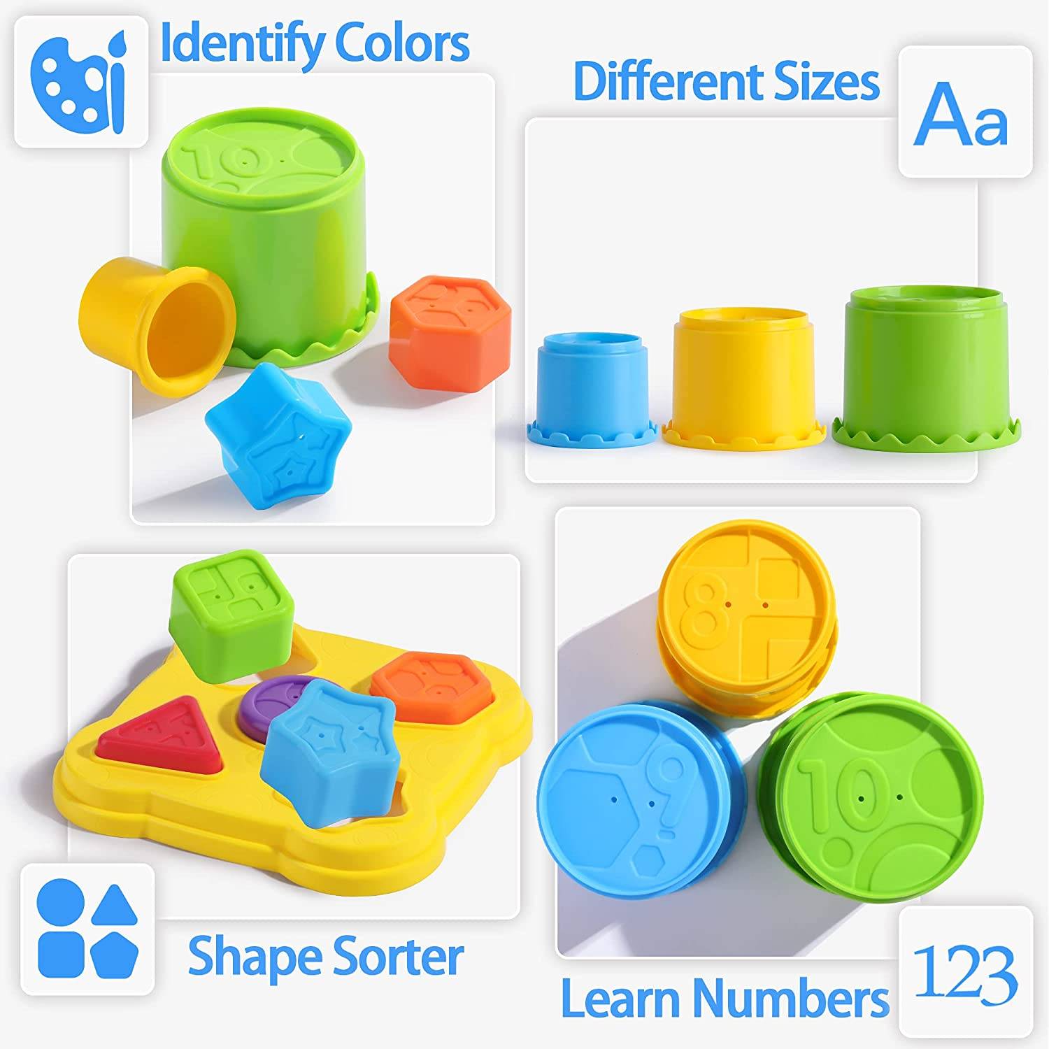Ваш ребенок может складывать и складывать чашки, распознавать цвета, различать размеры, сочетать формы и цифры для обучения. Игра развивает у детей мелкую моторику, координацию рук и глаз и навыки решения проблем.