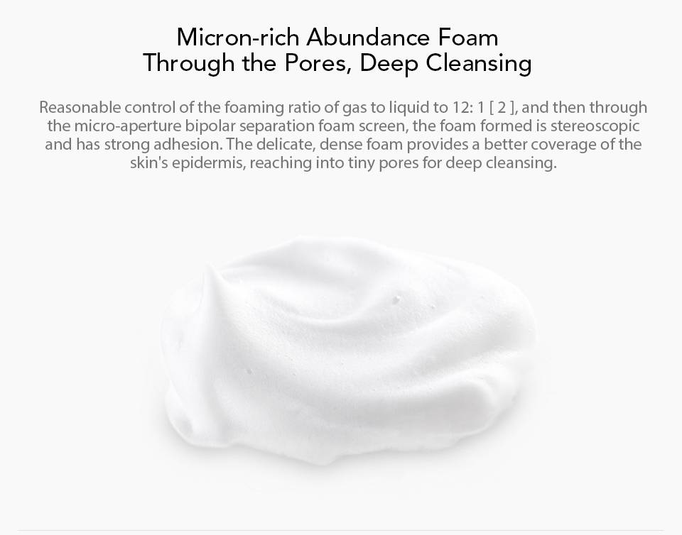Разумный контроль коэффициента вспенивания газа до жидкости до 12:1[2], а затем через микродиафрагму Биполярный разделительный Поролоновый экран, пенообразованная стереоскопическая и имеет сильную адгезию. Деликатный, Плотная пена обеспечивает лучшее покрытие эпидримиса кожи, достигая крошечных пор для глубокого очищения.