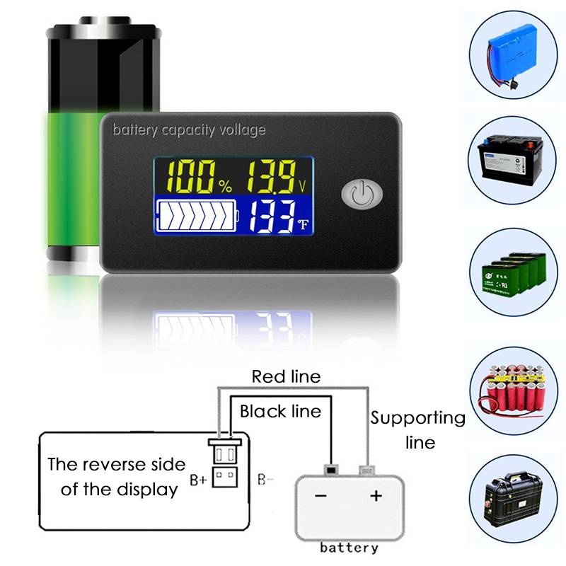 <Подходящий аккумулятор: монитор емкости аккумулятора Подходит для литиевых аккумуляторов 10-100 в, свинцово-кислотных аккумуляторов, литий-фосфатных батарей, Ni-MH и других батарей.