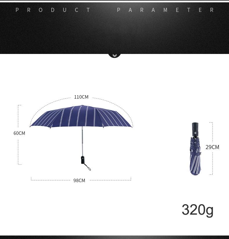 Полностью автоматический открытый/cloose Откройте зонтик под диаметром: 98 см Высота открытия: 60 см Длина обвала: 29 см Вес: 320 г Материал каркаса: сталь Превосходная водоотталкивающая способность Супер прочный: сталь и стекловолокно supprt bone Автоматический открытый зонтик обеспечивает быструю и удобную защиту от погодных условий для непогоды в дождливые и влажные дни. Зонт идеально подходит для погружения в сумку, автомобиль или портфель для мгновенной защиты от дождя. Оправа обладает повышенной прочностью благодаря большому навесу, а ручка обеспечивает гладкий и надежный захват.