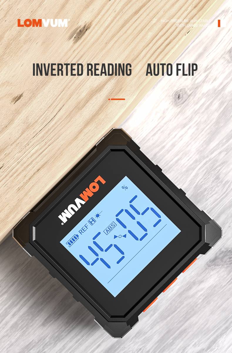 LOMVUM Laser Digital Protractor имеет Карманный и легкий размер. Когда Инклинометр перевернут вверх дном, угол считывания на ЖК-дисплее автоматически откидывается и легко читается.