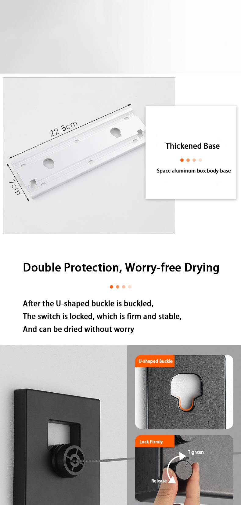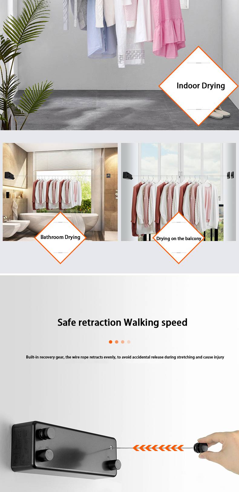 1. Выдвижная линия одежды, используется Встроенная Шестерня для переработки, и стальной трос убирается с постоянной скоростью, чтобы избежать травм, вызванных ослаблением провода при растяжении троса.