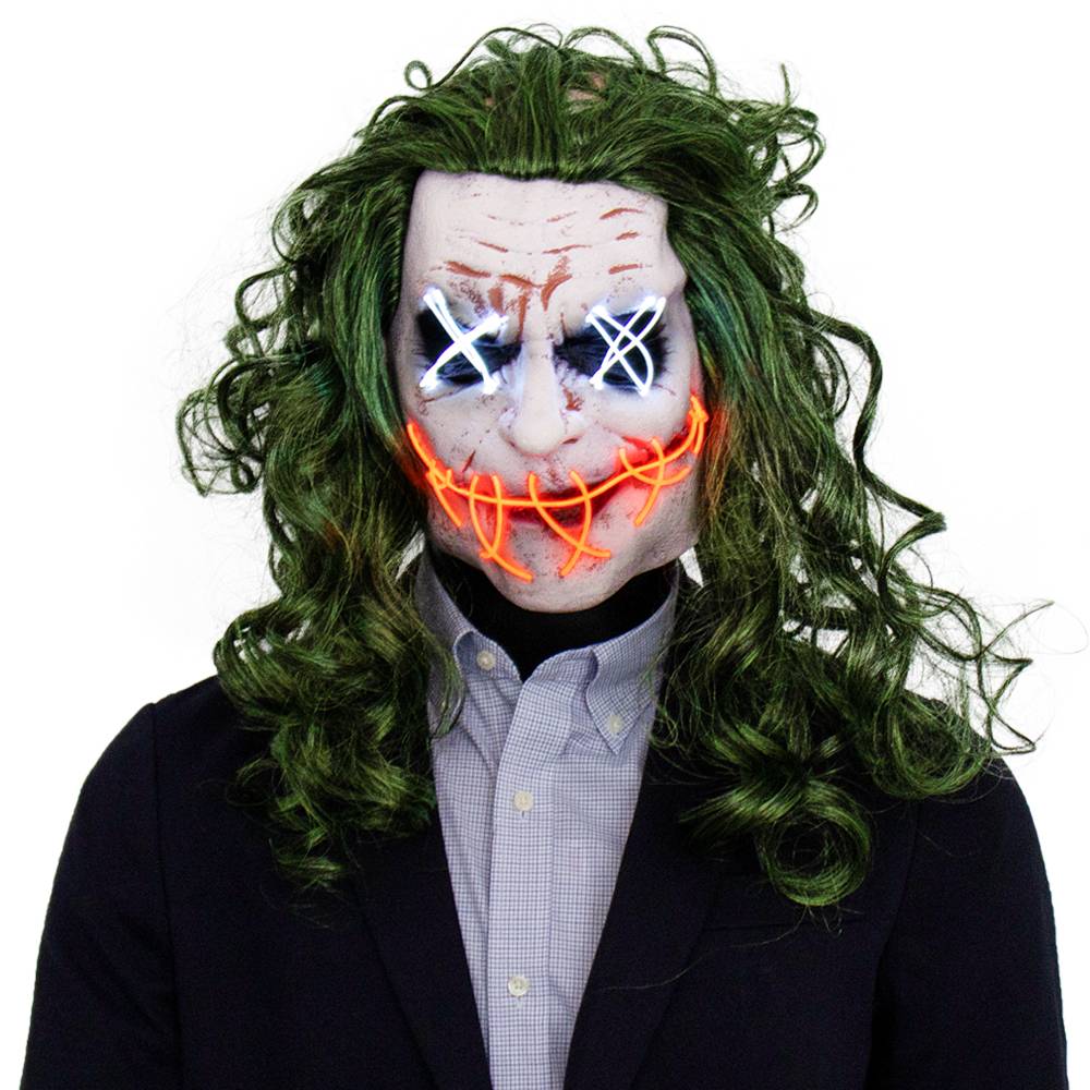 Ужас Джокер светодиодный свет MaskCosplay клоун EL Wire светящиеся зеленые волосы латексные маски Хэллоуин костюм реквизит