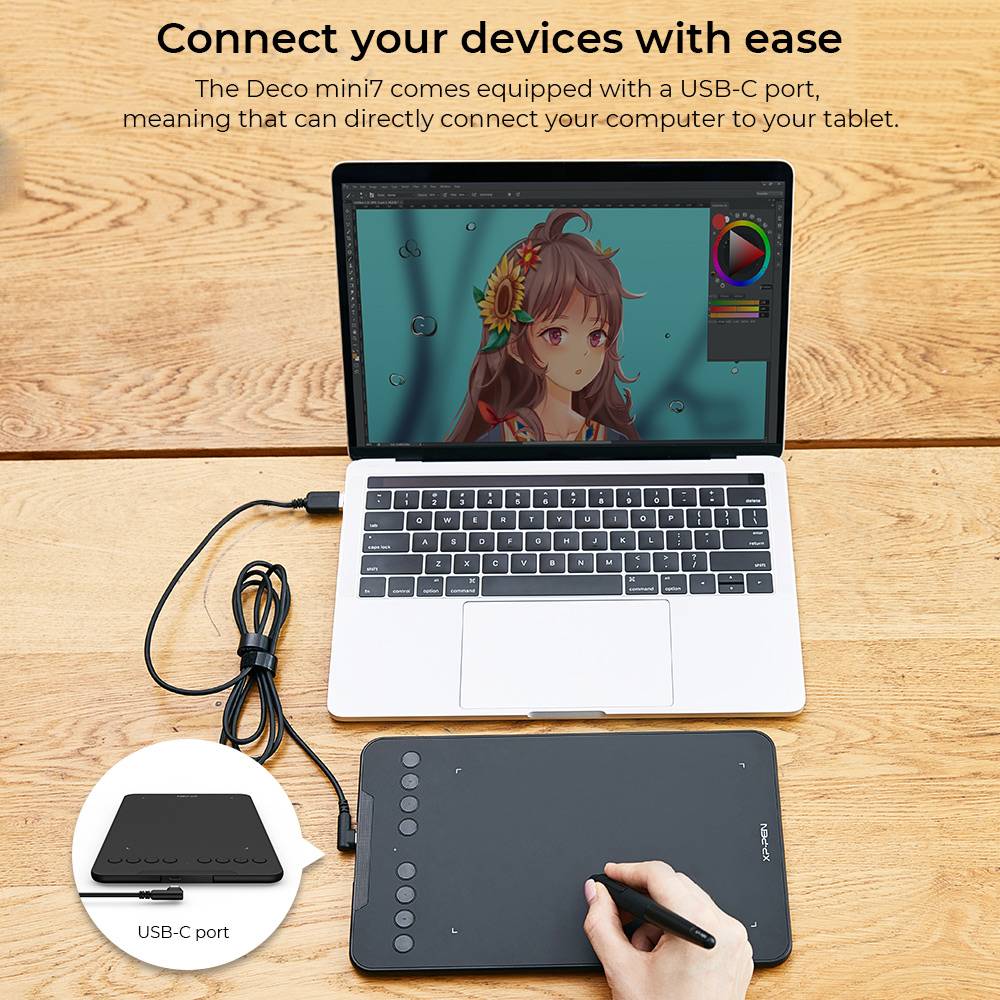Deco mini7 поставляется с пассивным стилусом P05D, который работает в течение долгих часов, что позволяет создавать без перерывов. Стилус также поддерживает до 60 градусов наклона, что делает затенение легким и эффективным.