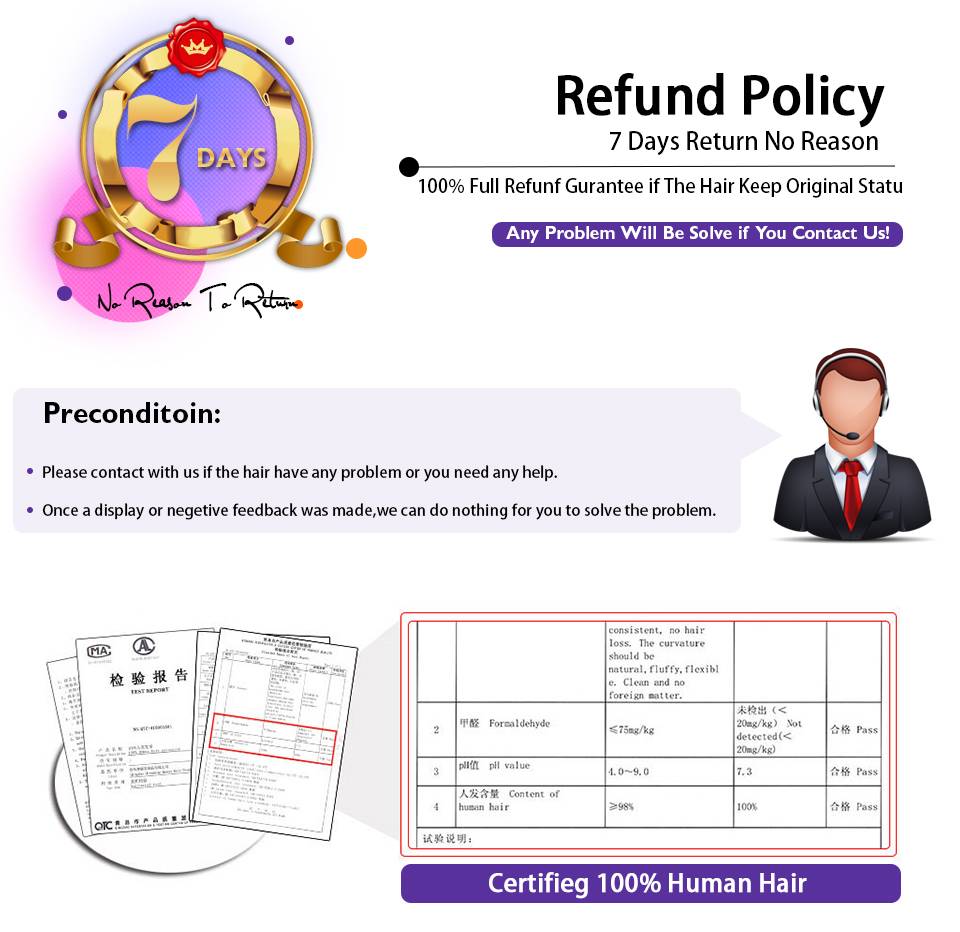 Refund Policy We provide "no reason to return" ,100% full refund gurantee if the hair keep original status .Any Problem Will Be Solved If You Contact Us. Precondions :please contact us if hair has any probelm or you need any help .once a display or negetive feedback was made ,we can do nothing for you to solve the problem .