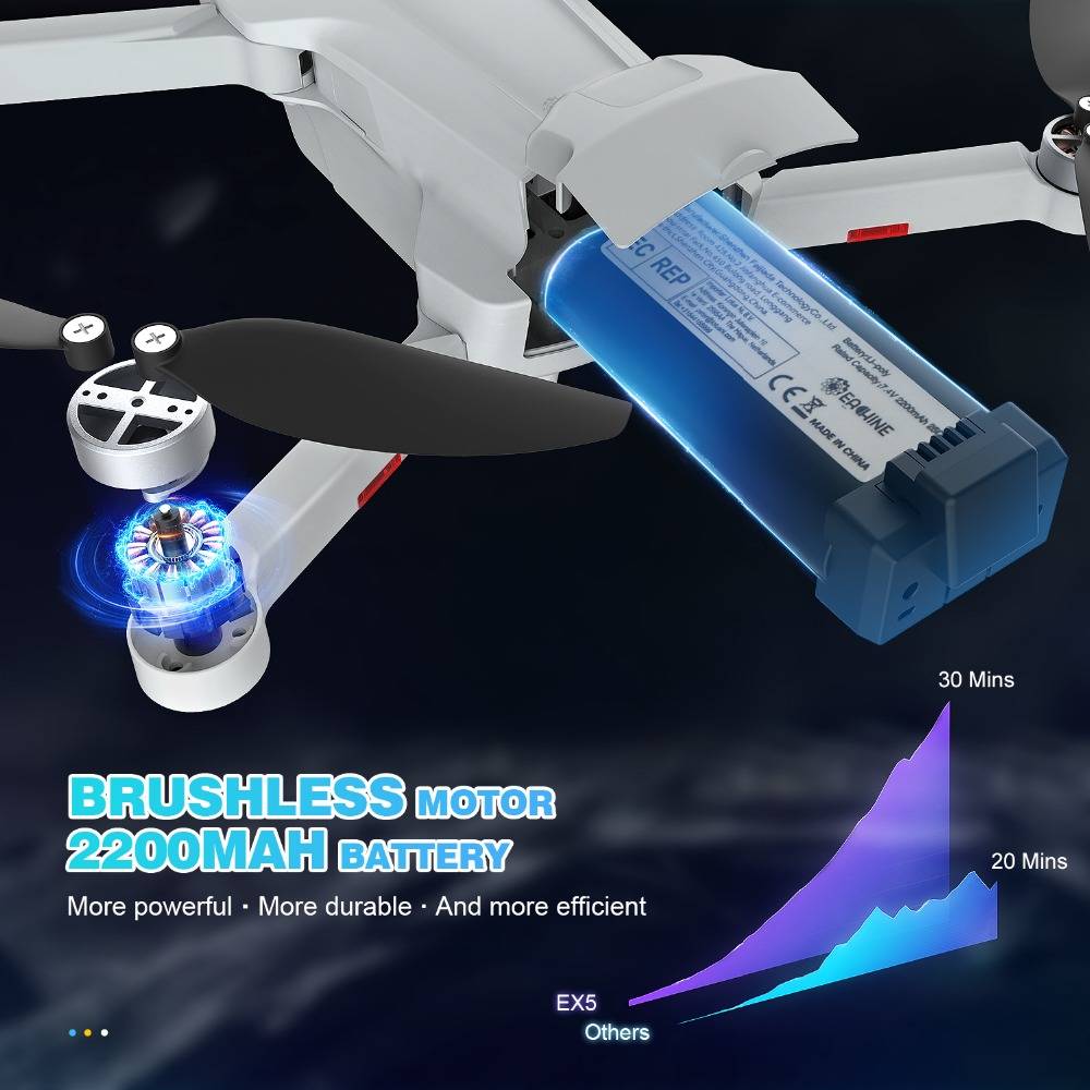 【Бесщеточный двигатель и аккумулятор большой емкости 】: Бесщеточный двигатель с авиационными пропеллерами для высокой аэродинамической эффективности, которая более тихая и долговечная, чем матовый двигатель. Аккумулятор большой емкости обеспечивает Дрон30 минут времени полетаБез подзарядки.