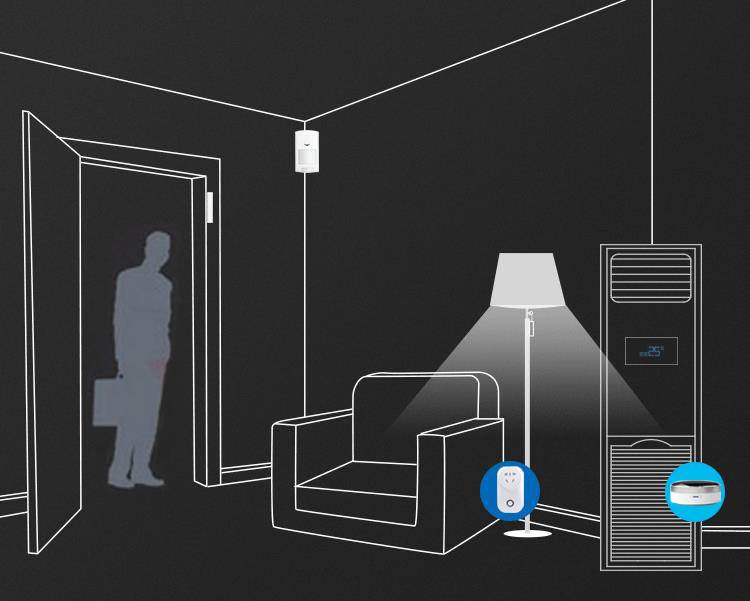 -- Обнаружение состояния открытия/закрытия двери/окна и отправка сигнала тревоги на мобильный телефон после изменения статуса. ※ Дверь открывается/закрыта-датчик двери посылает сигнал на шлюз-маршрутизатор, затем маршрутизатор отправляет сигнал тревоги в приложение В вашем мобильном телефоне.