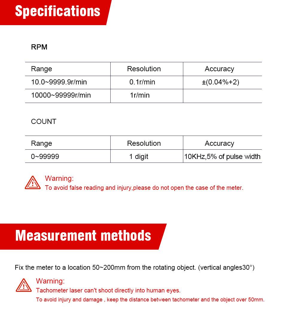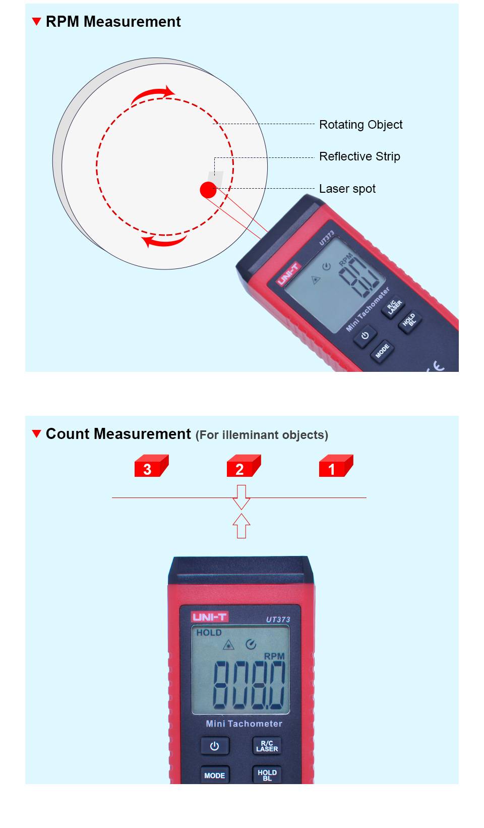 UT373 является надежным цифровым бесконтактным тахометром, используемым для измерения скорости вращения двигателей и других машин. Это устройство может отображать результаты в оборотах или оборотах. UT373 способен безопасно измерять вращающиеся объекты с помощью неинтрузивного метода.