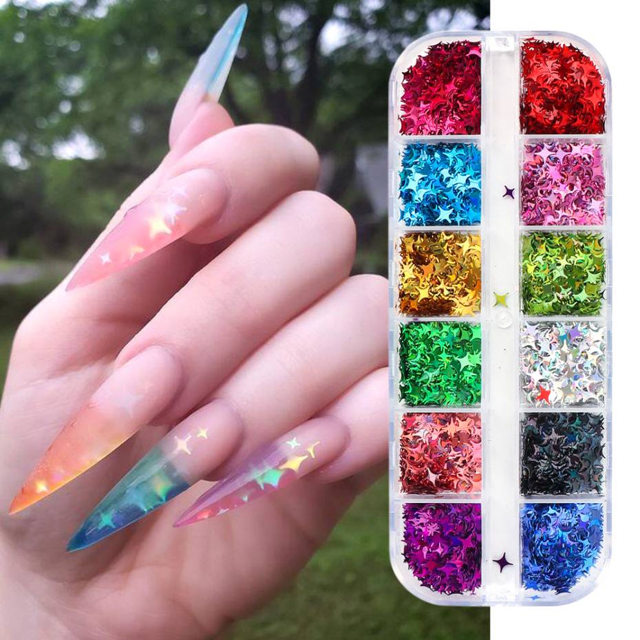 12 Сетки голографические ногти блестки ультратонкие четырехконечные звезды лазерные хлопья Блестки Дизайн ногтей украшения аксессуары
